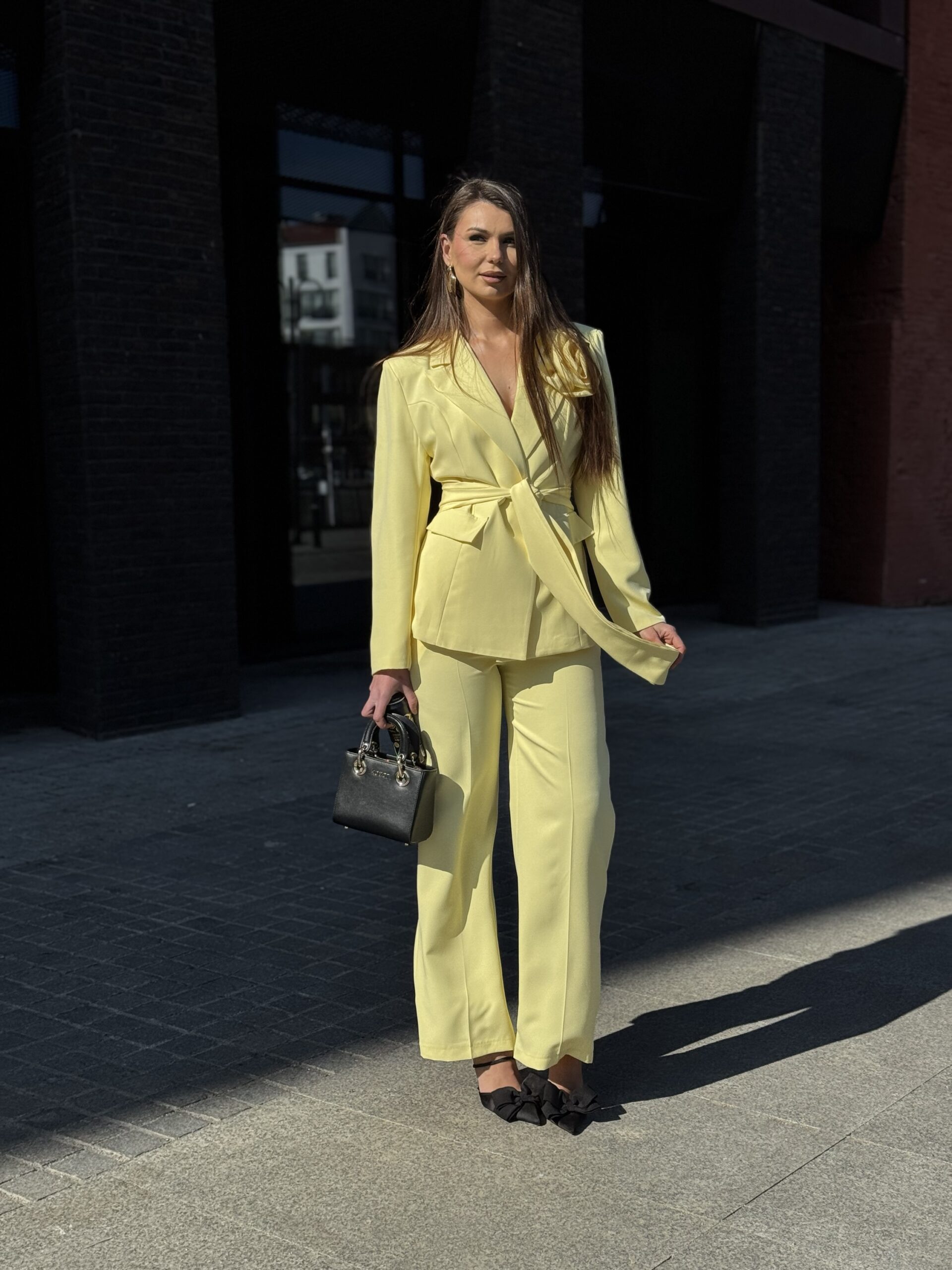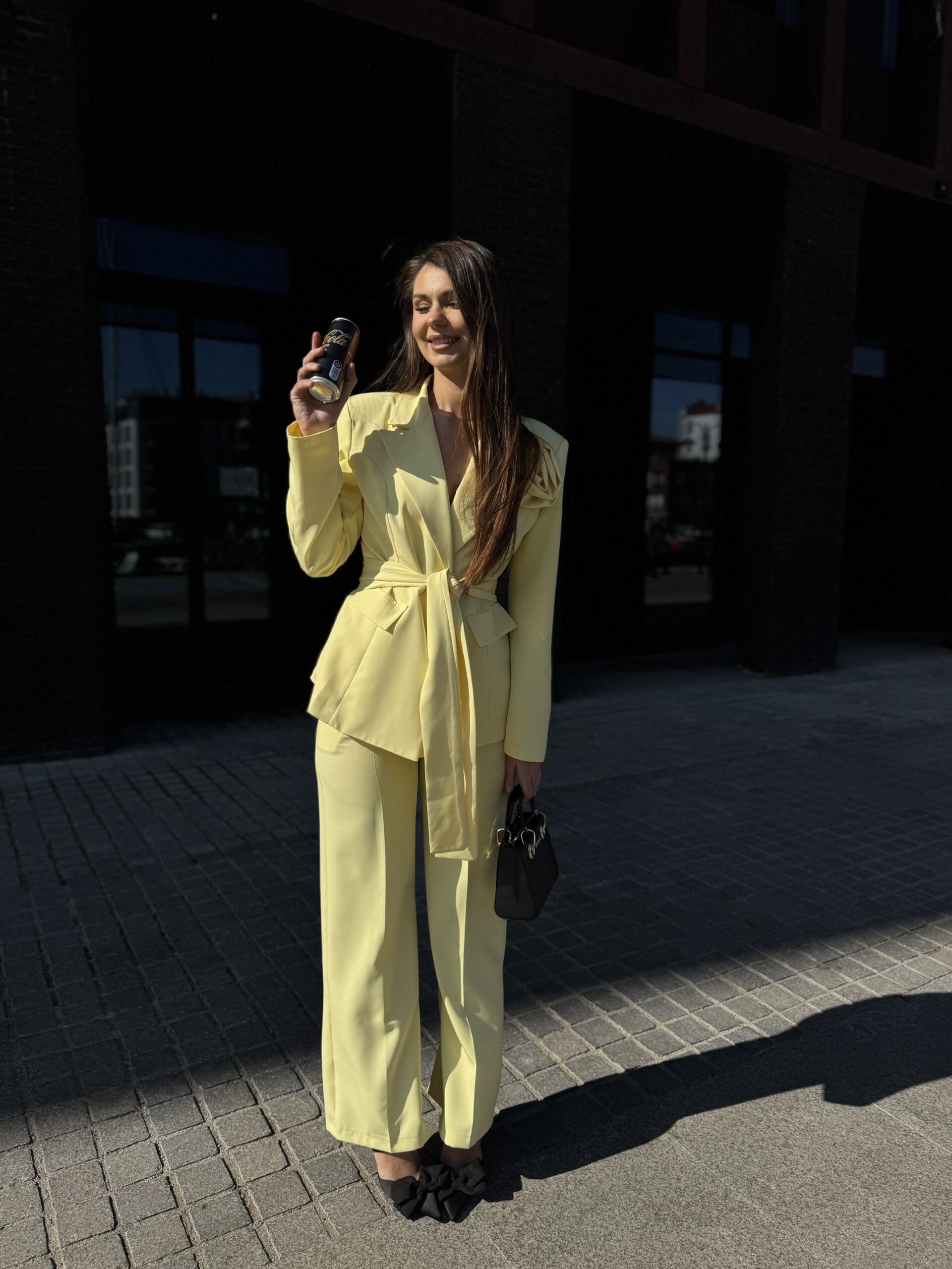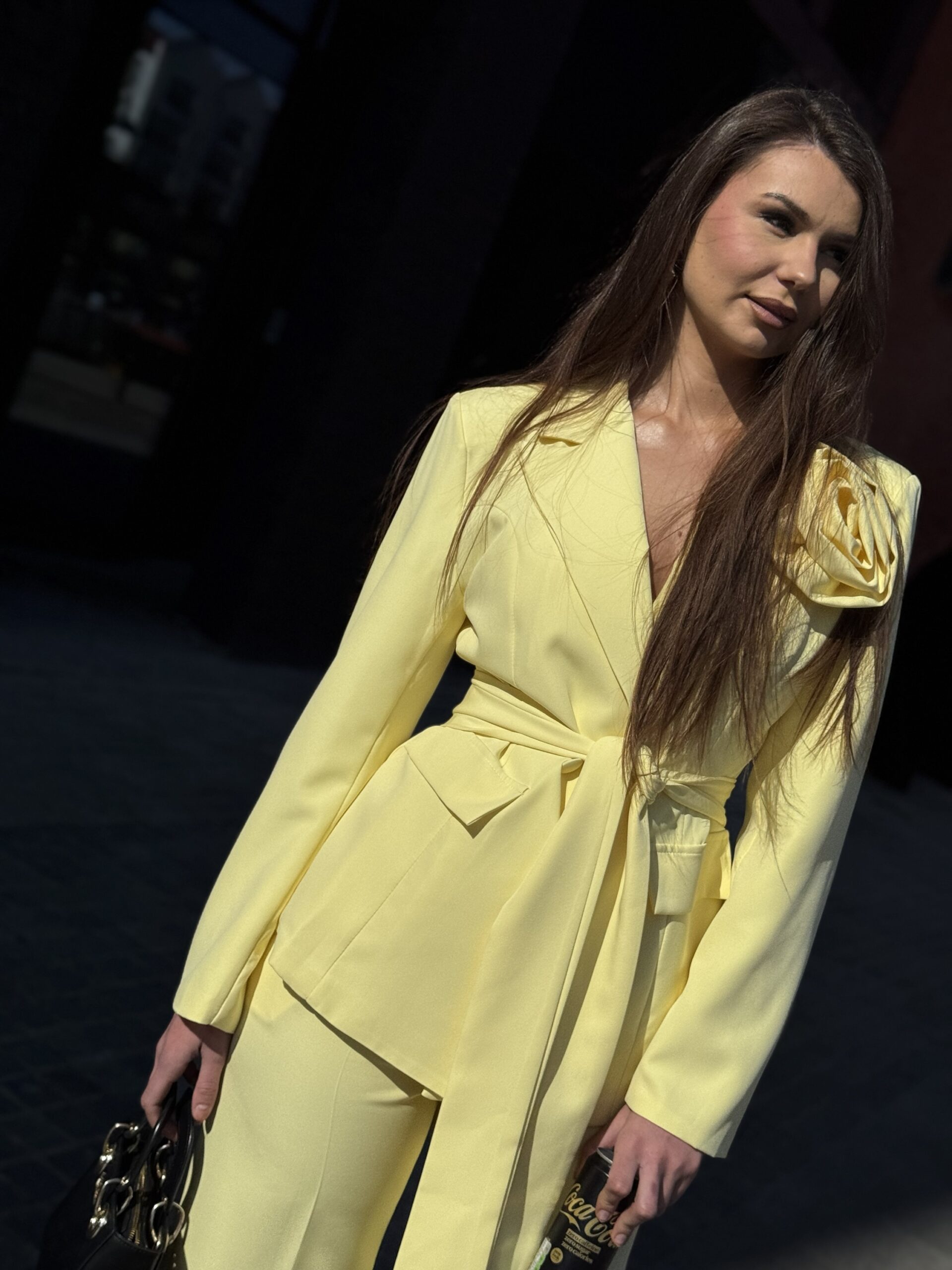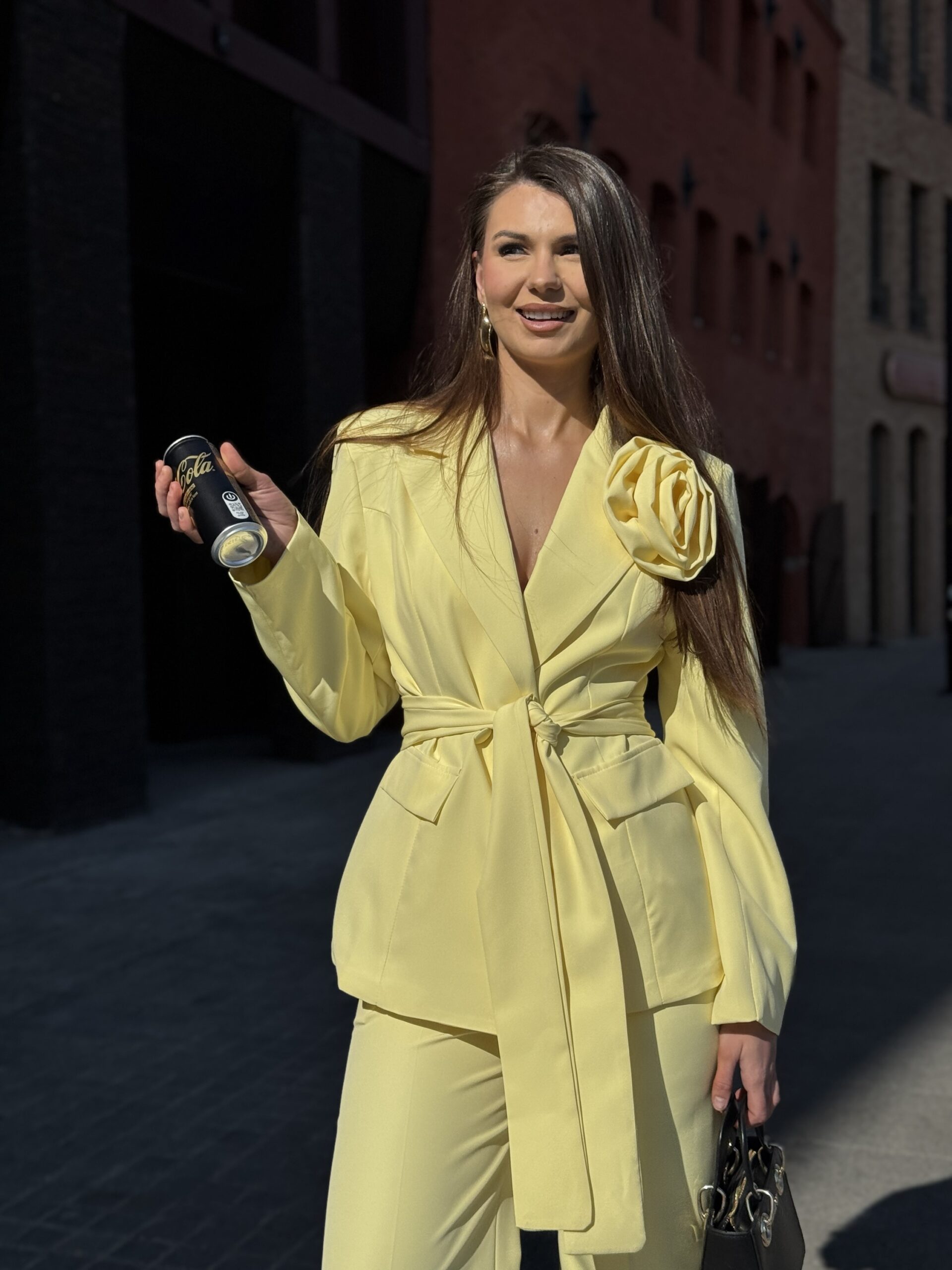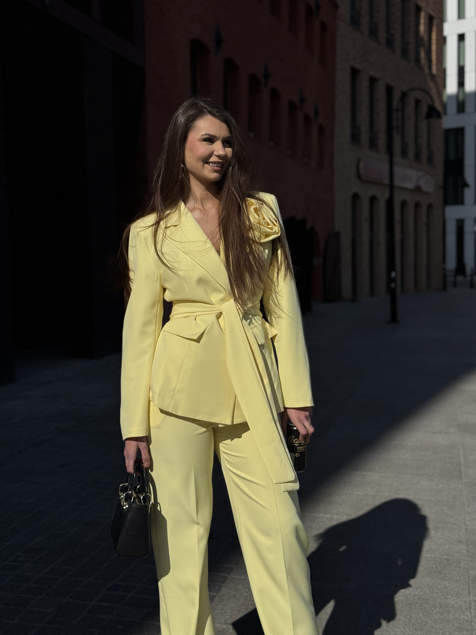 - Fason: Elegancki garnitur z prostymi spodniami w kant oraz gumką w pasie i dopasowaną marynarką – ponadczasowy krój, który pięknie układa się na sylwetce.