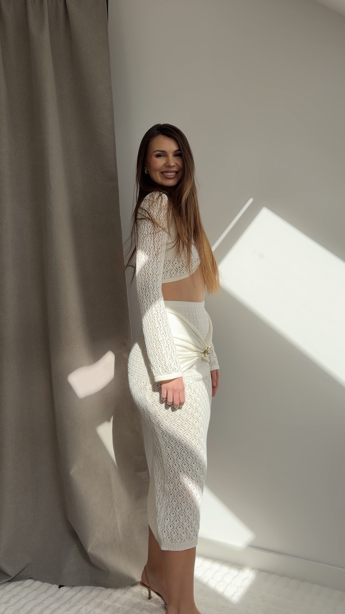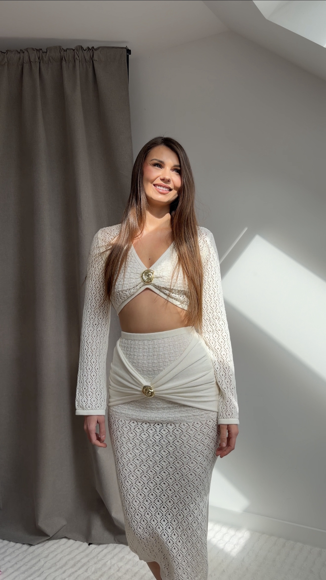 Komplet: Dwuczęściowy zestaw – dopasowana spódnica midi + krótki top à la sweterek. Materiał: 100% bawełna – naturalna, oddychająca i komfortowa w noszeniu. Detal: Ozdobne broszki (góra i dół) – odpinane, możesz stylizować komplet na różne sposoby. Fason: Ażurowa struktura z zabudowanymi strefami w okolicach biustu i bioder – zapewnia komfort i brak prześwitu. Styl: Idealny na lato – sprawdzi się zarówno na wakacjach, jak i w codziennych stylizacjach do miasta. Modelka: Dagmara ma 170 cm wzrostu i ma na sobie rozmiar one size. Rozmiar: Materiał elastyczny, dobrze dopasowuje się do sylwetki.