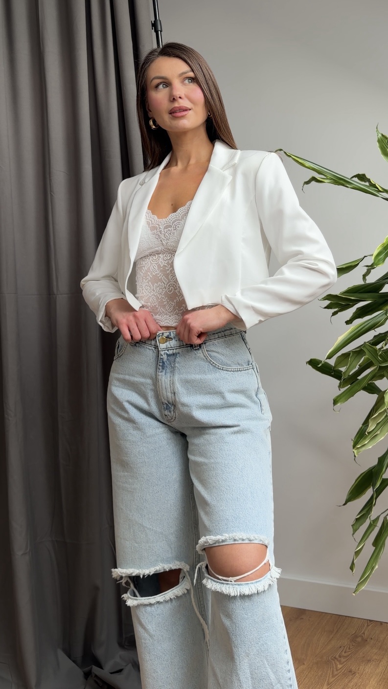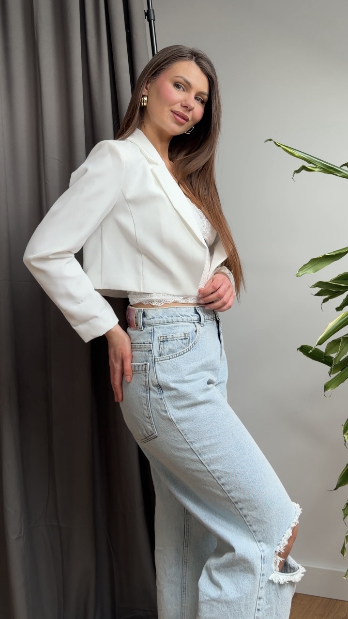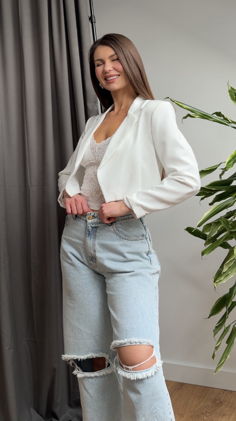 - Fason: Krótki żakiet o prostym, nowoczesnym kroju- nie jest ani oversize, ani bardzo dopasowany, dzięki czemu świetnie układa się na sylwetce.