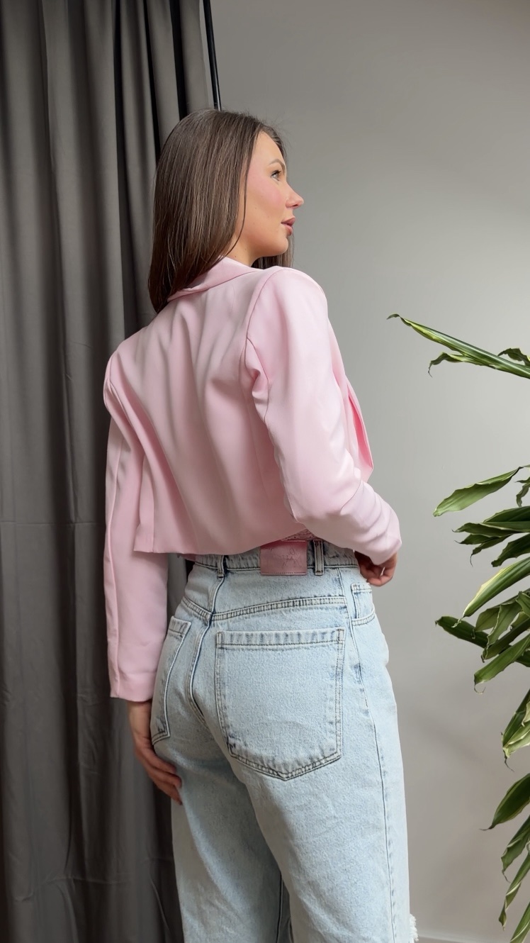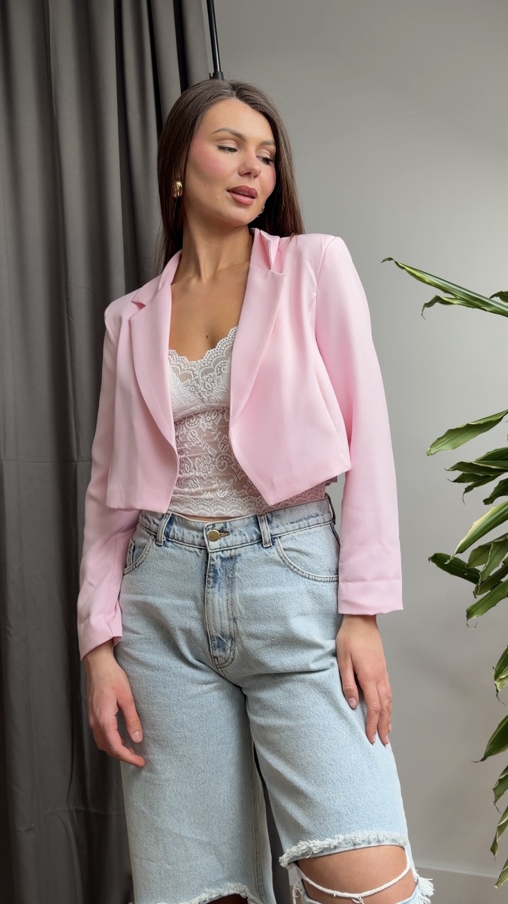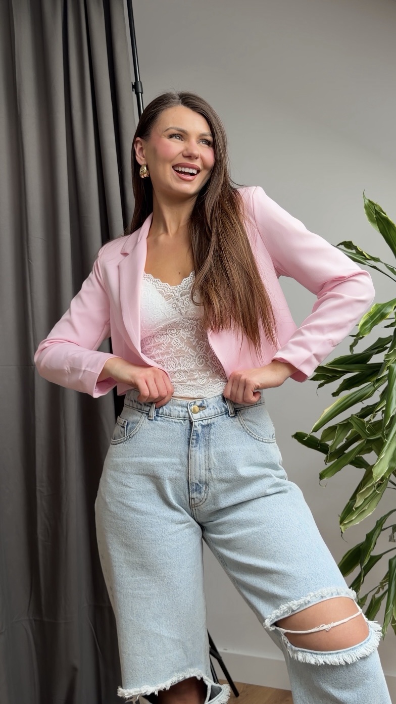 - Fason: Krótki żakiet o prostym, nowoczesnym kroju- nie jest ani oversize, ani bardzo dopasowany, dzięki czemu świetnie układa się na sylwetce.
