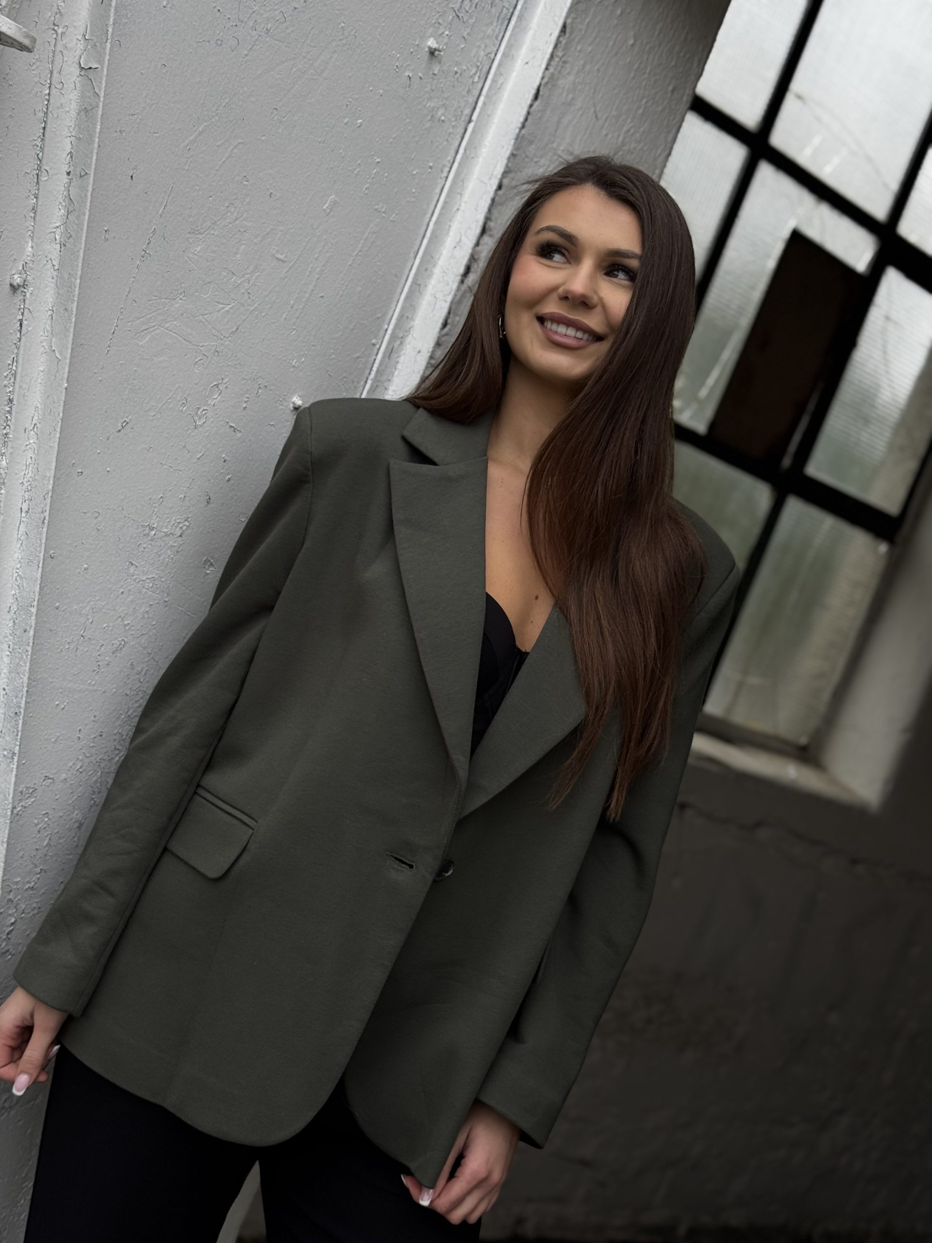 Stylowa dresowa marynarka oversize w kolorze khaki, która dodaje nowoczesnego szyku i komfortu każdej stylizacji. Idealna na co dzień i na specjalne okazje. Poczuj się swobodnie i stylowo.