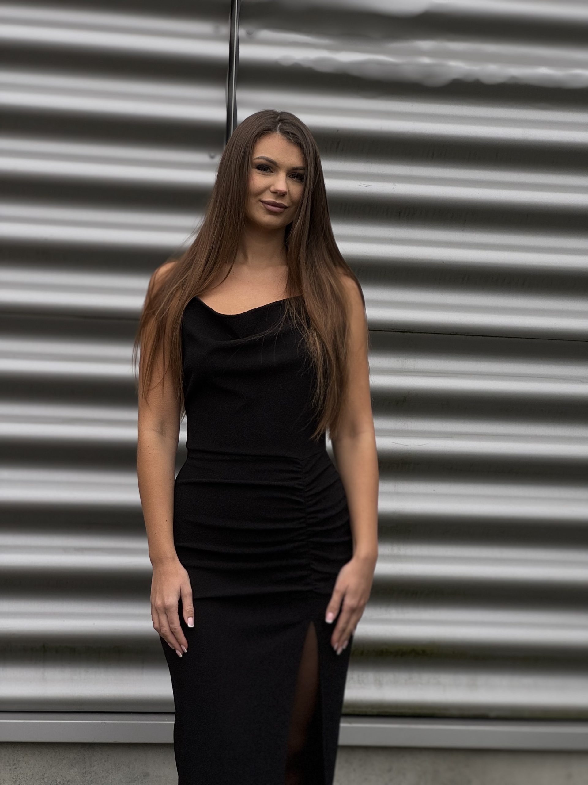 Z czym nosić: Sukienka świetnie komponuje się ze szpilkami w odcieniach srebra lub czarnym. Dopełnij ją małą torebką na łańcuszku i minimalistyczną biżuterią – i jesteś gotowa na wieczorne wyjście ✨