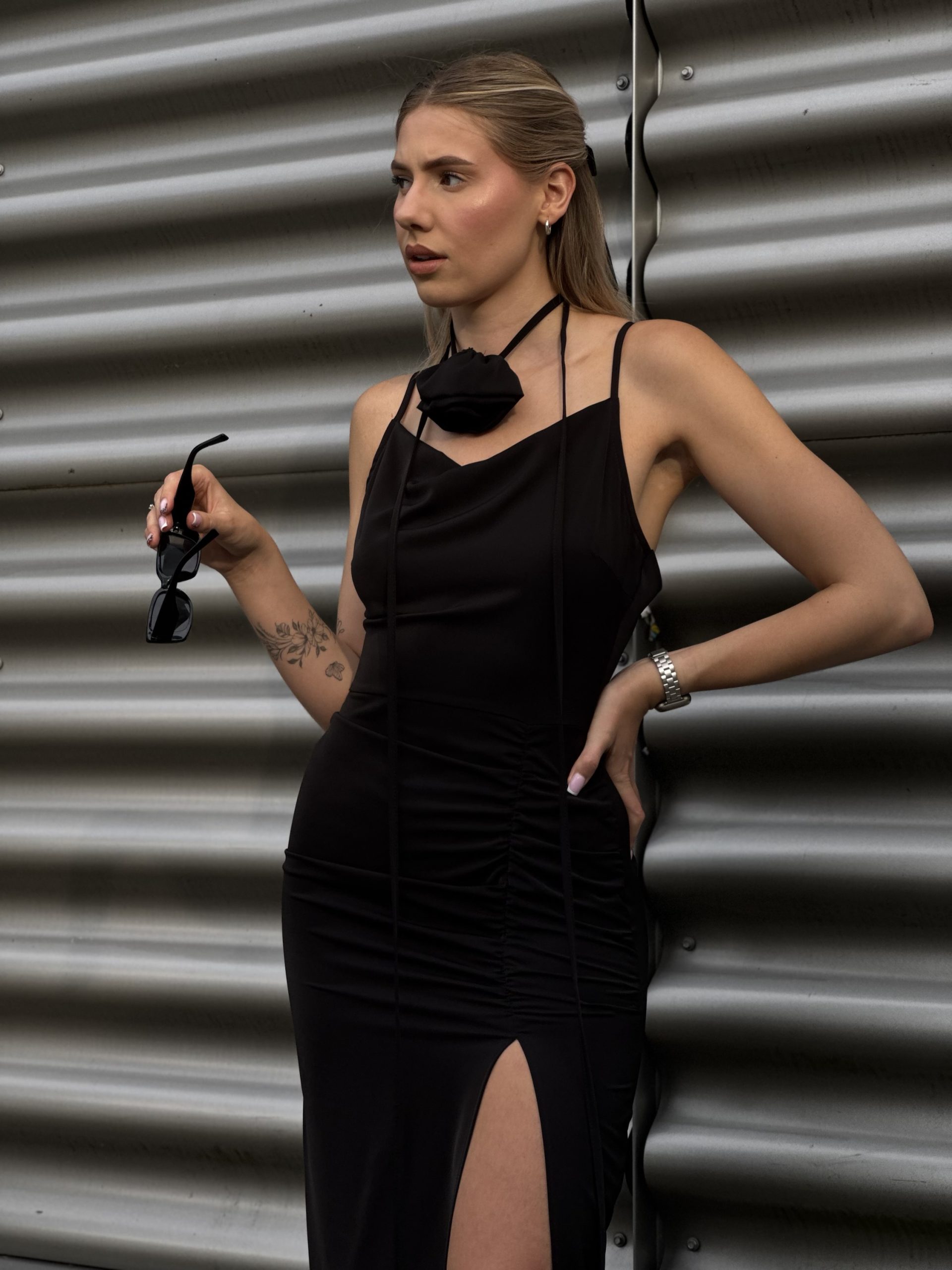 Wyjątkowa czarna sukienka z motywem róży. Odważna i seksowna, idealna na niezapomniane wieczory i imprezy.