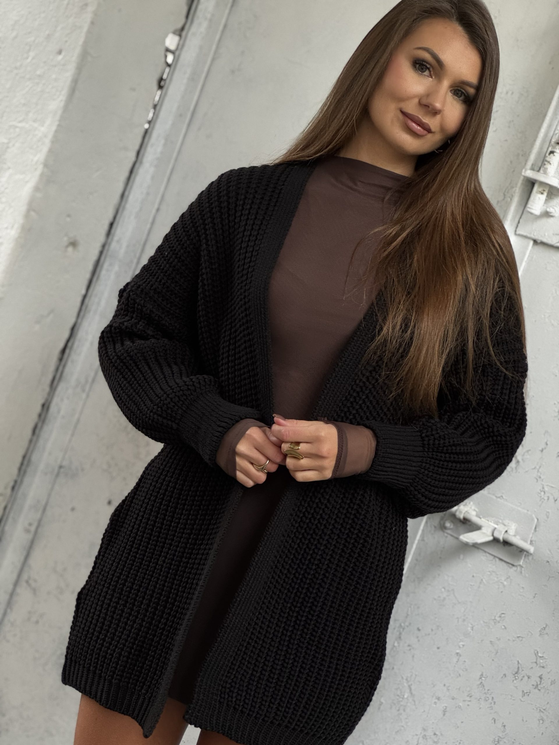 Miękki, przytulny kardigan w kolorze czarnym. Idealny na chłodniejsze dni — otuli, doda stylu i stworzy bazę dla wielu jesiennych stylizacji. Polski produkt o ponadczasowym fasonie.
