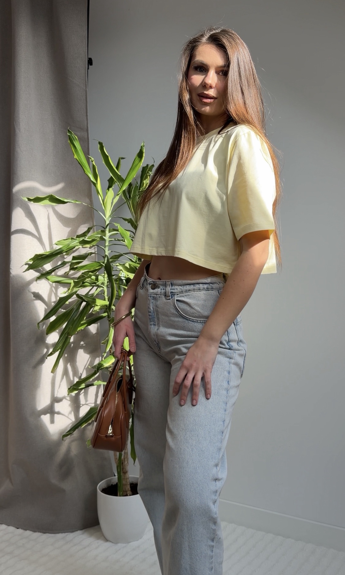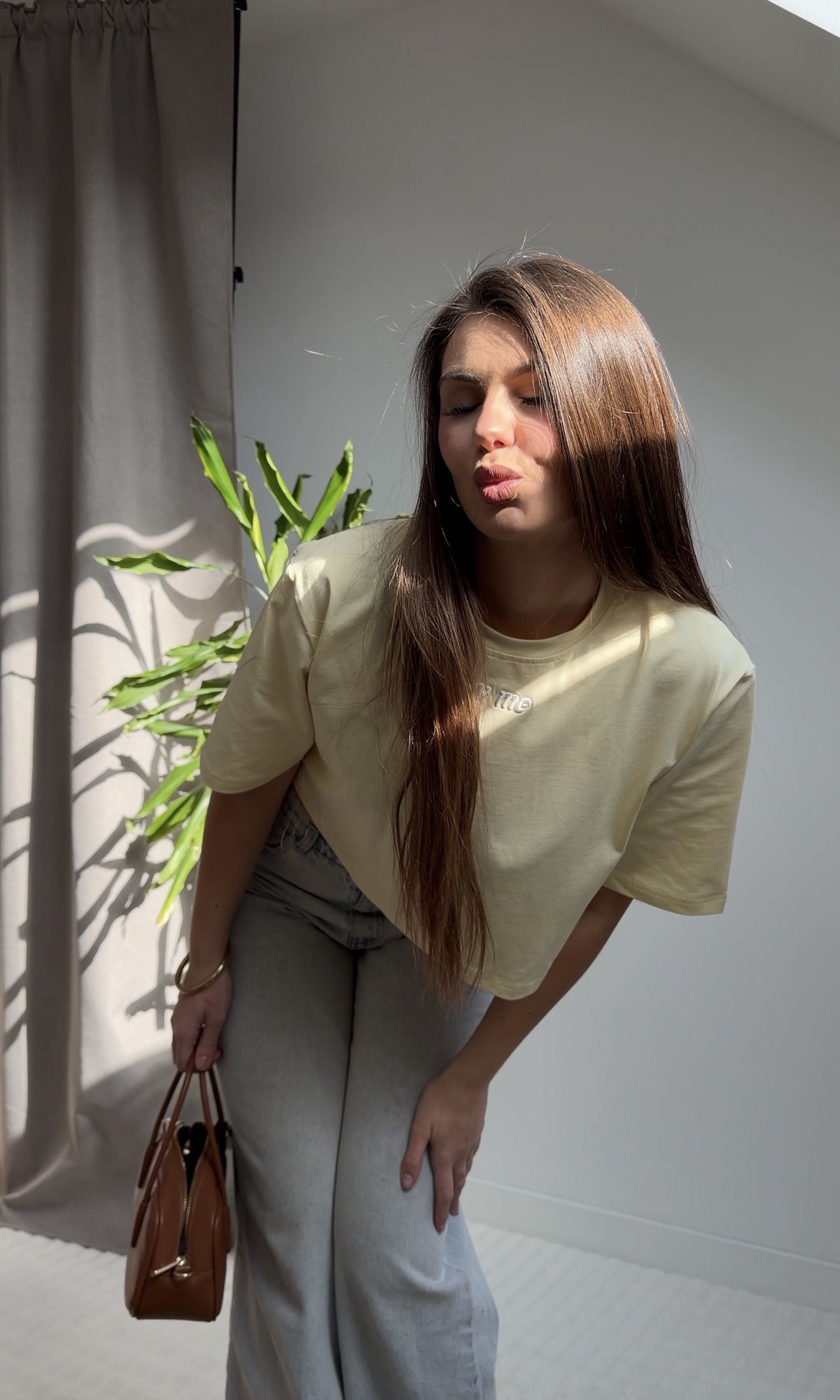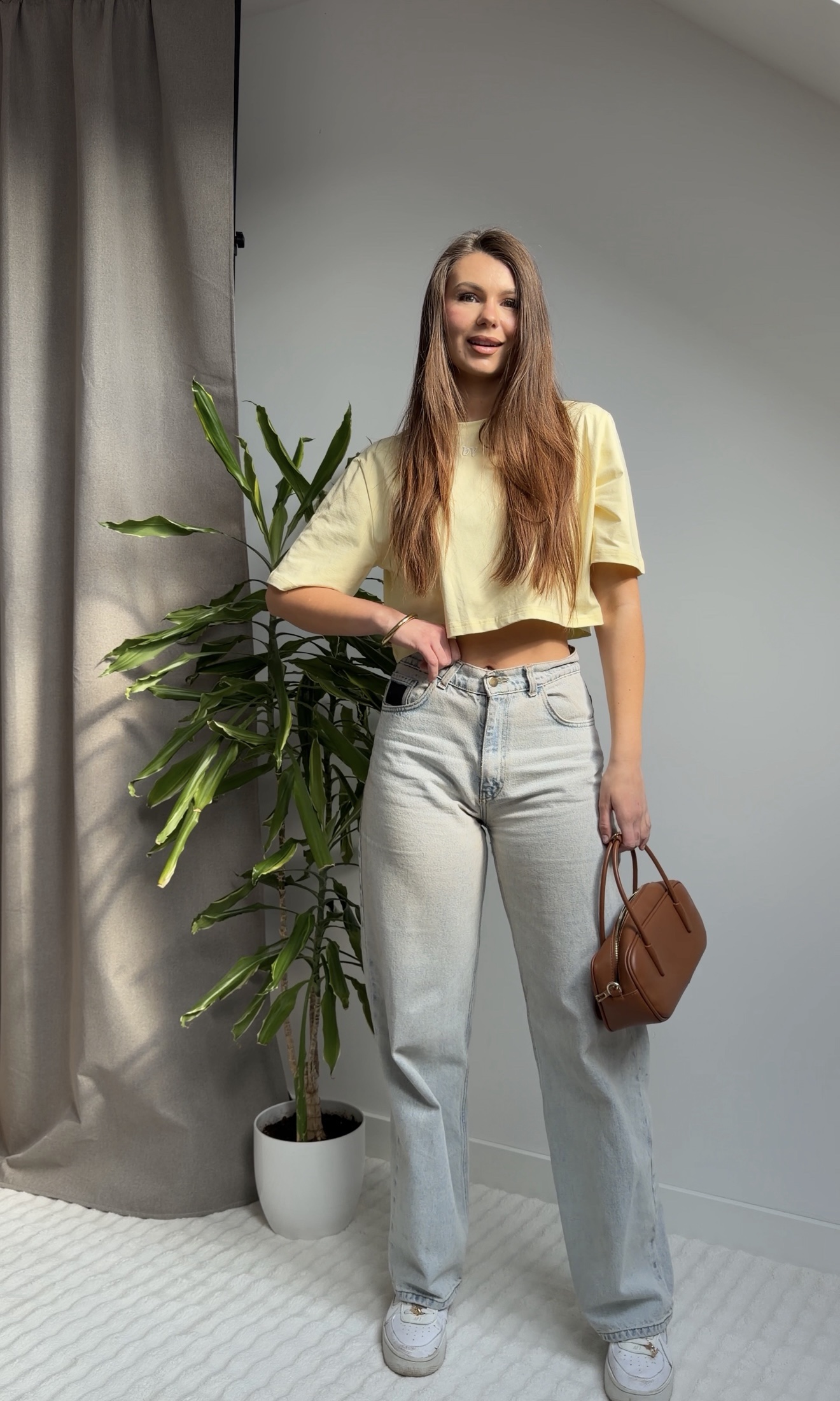 • Fason: Krótki t-shirt o luźniejszym kroju – lekko skrócona długość świetnie pasuje do spodni i spódnic z wysokim stanem.
