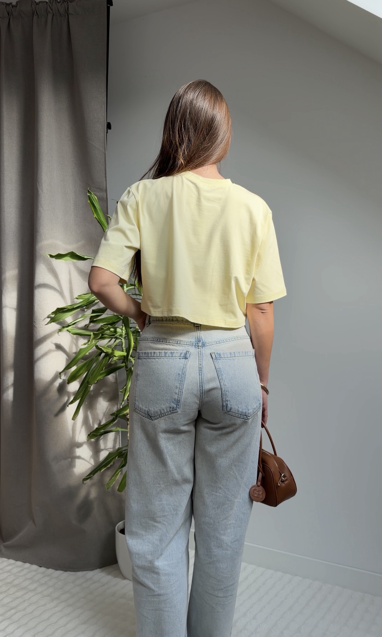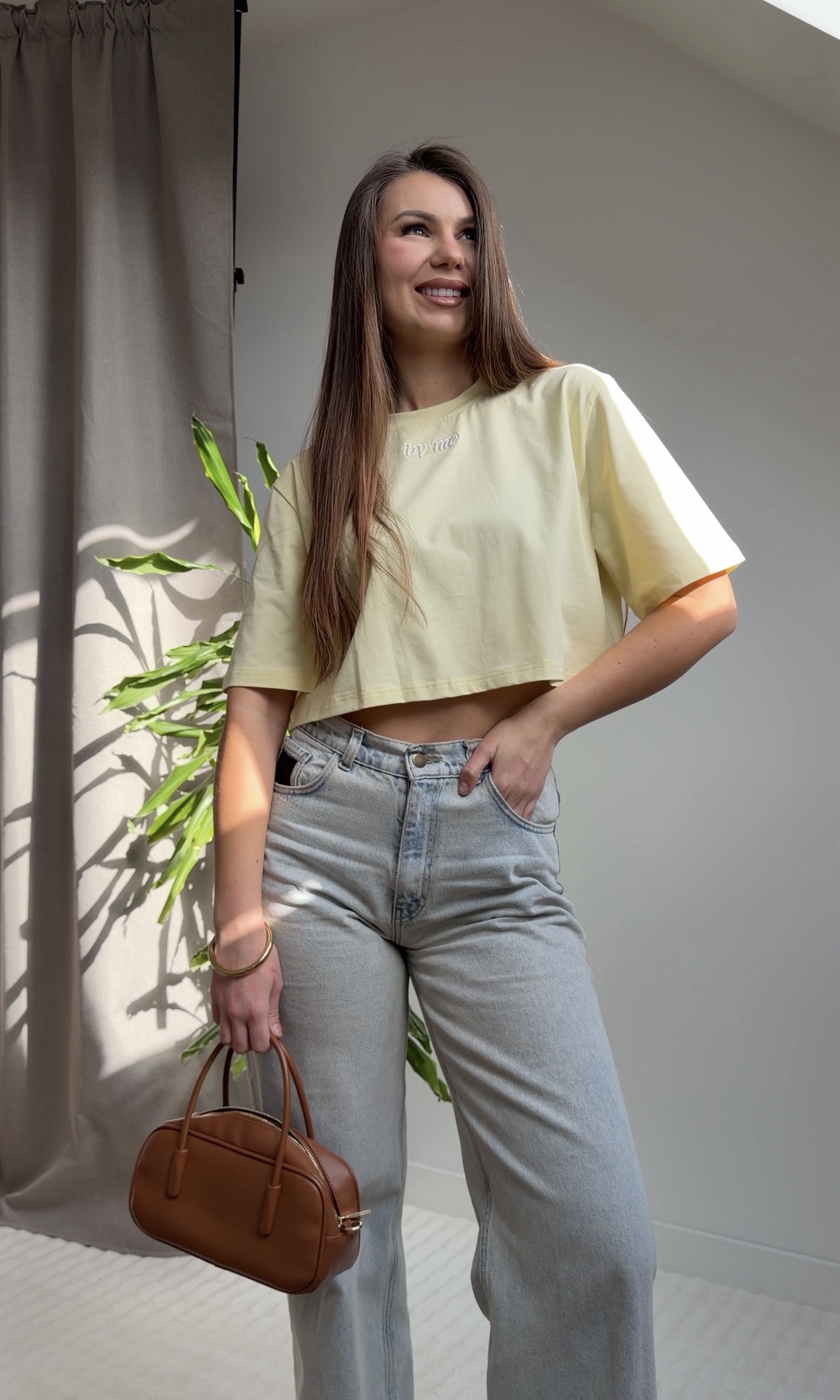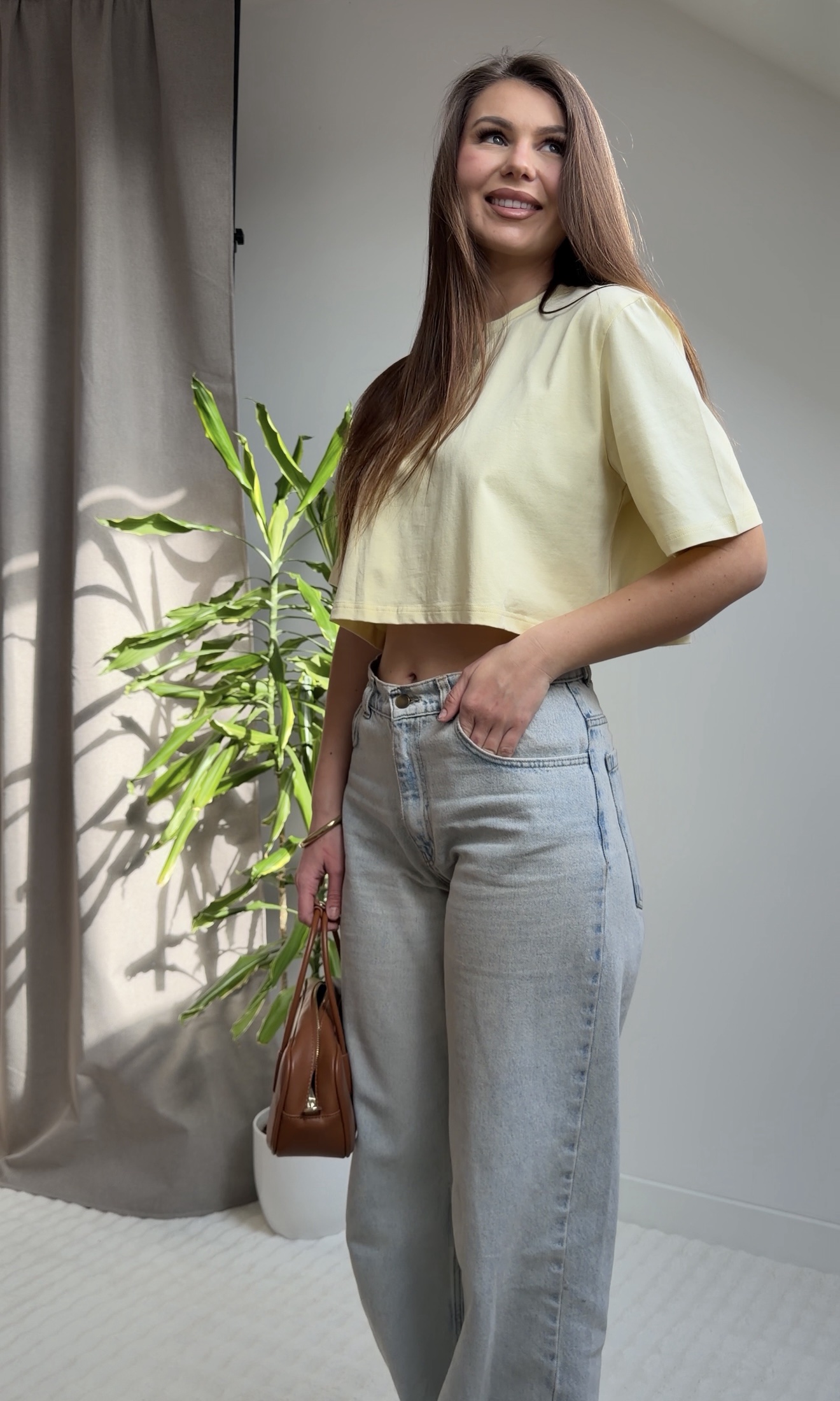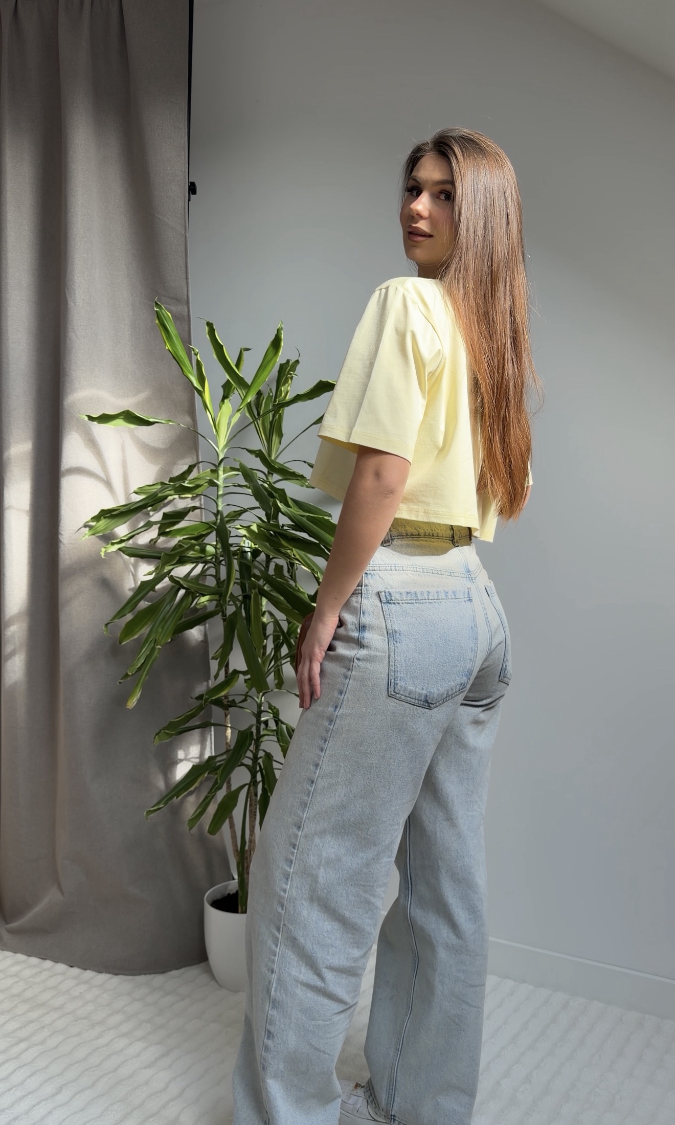 • Fason: Krótki t-shirt o luźniejszym kroju – lekko skrócona długość świetnie pasuje do spodni i spódnic z wysokim stanem.