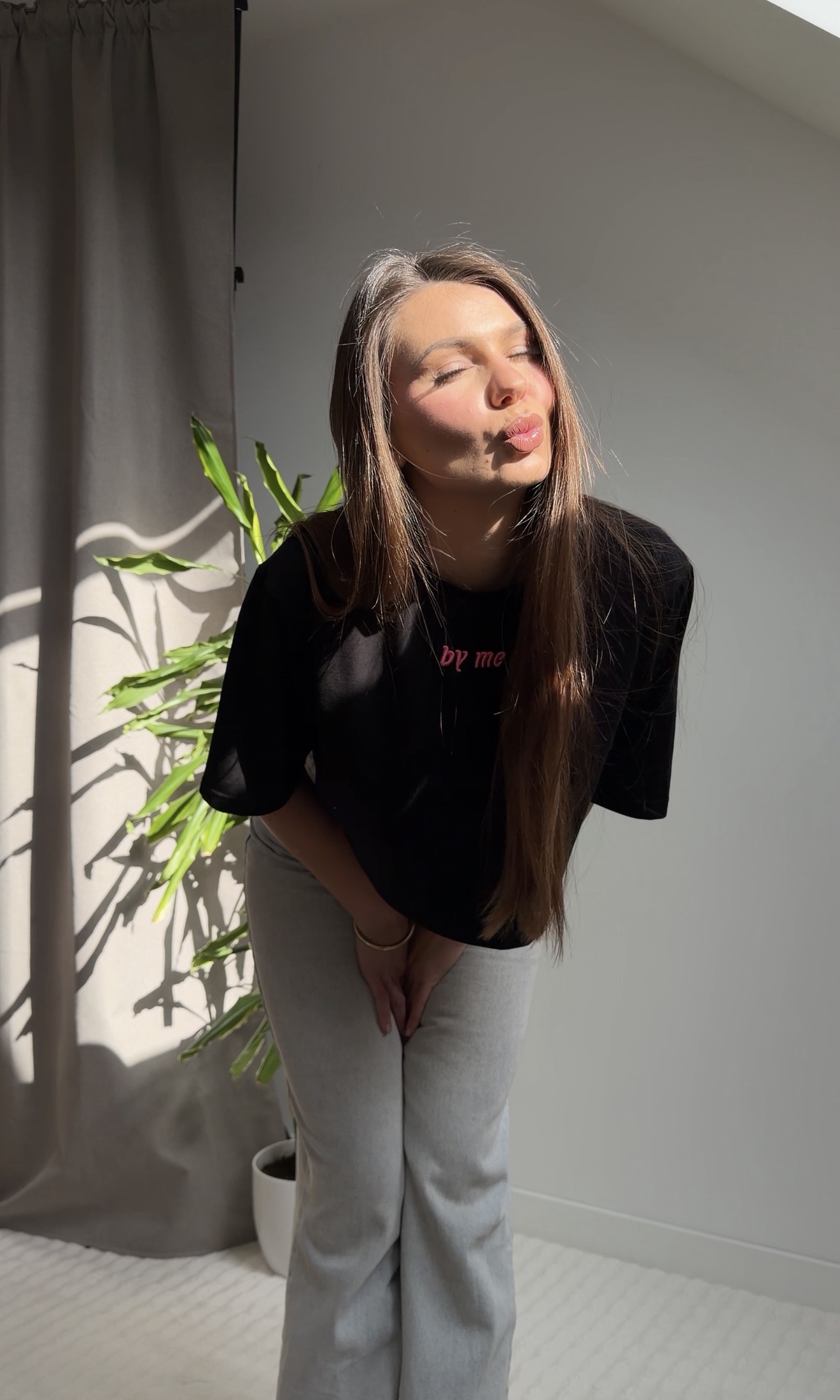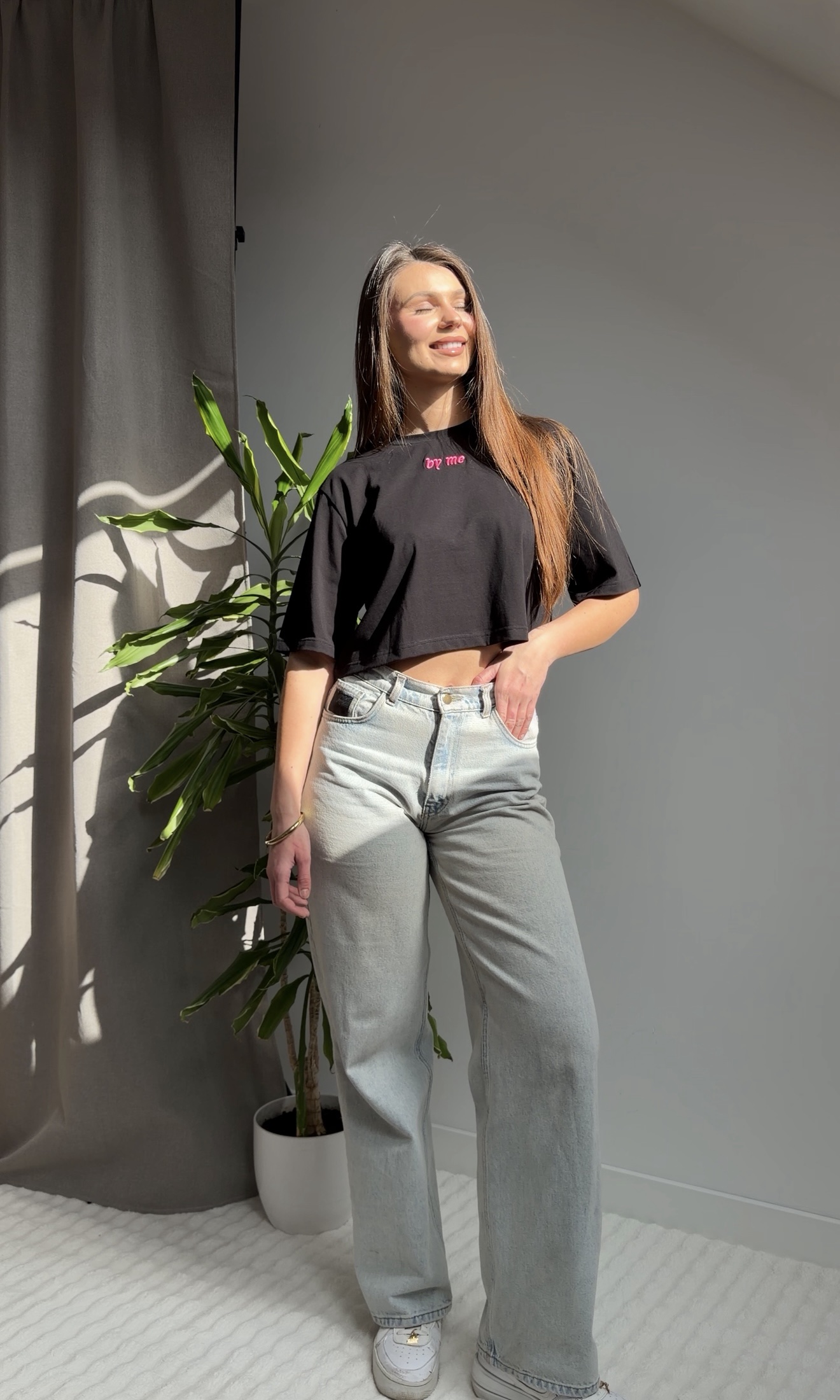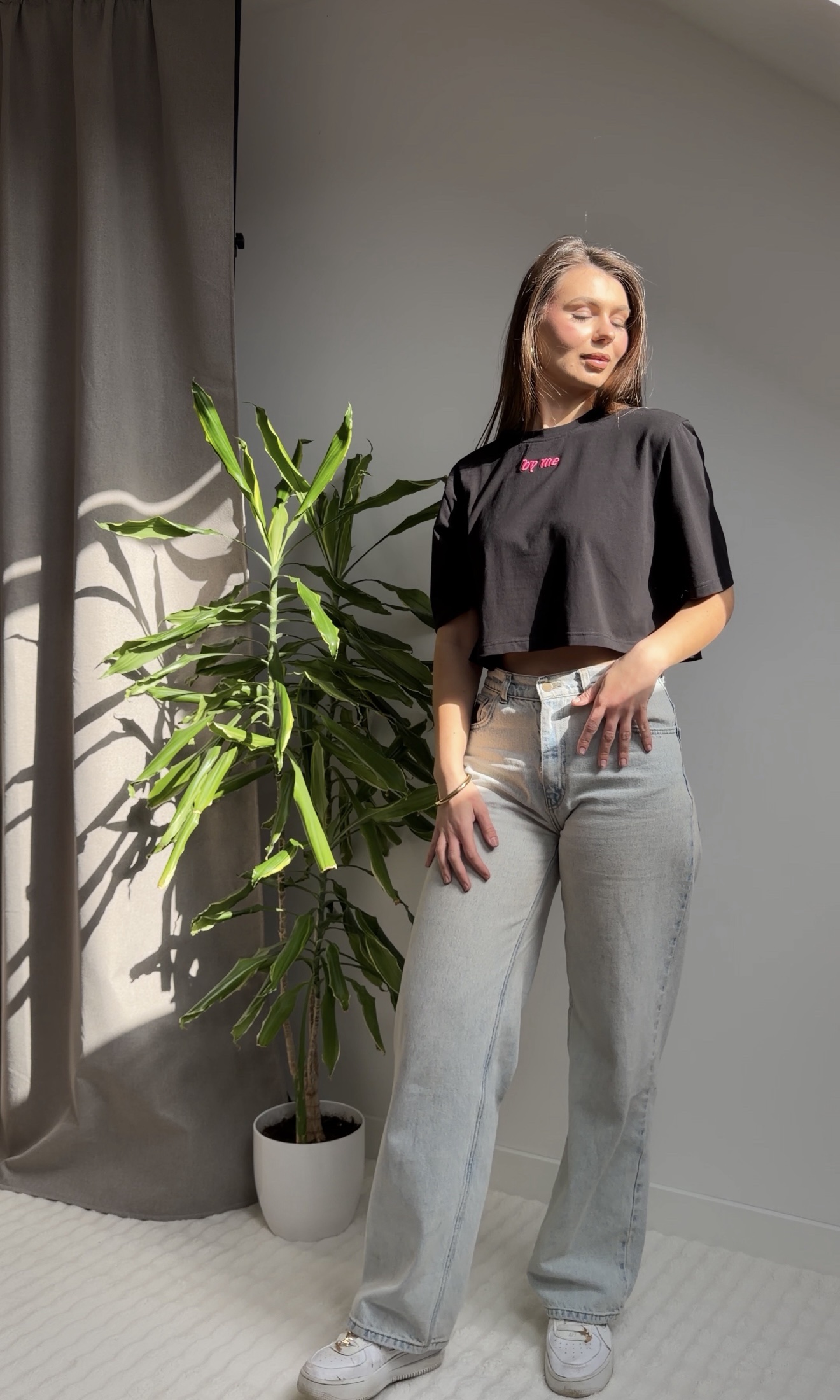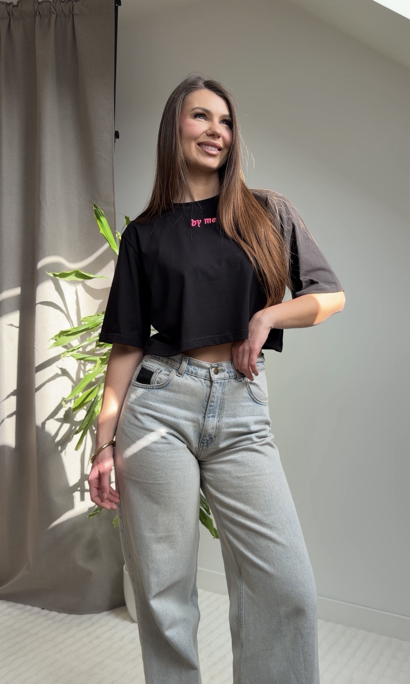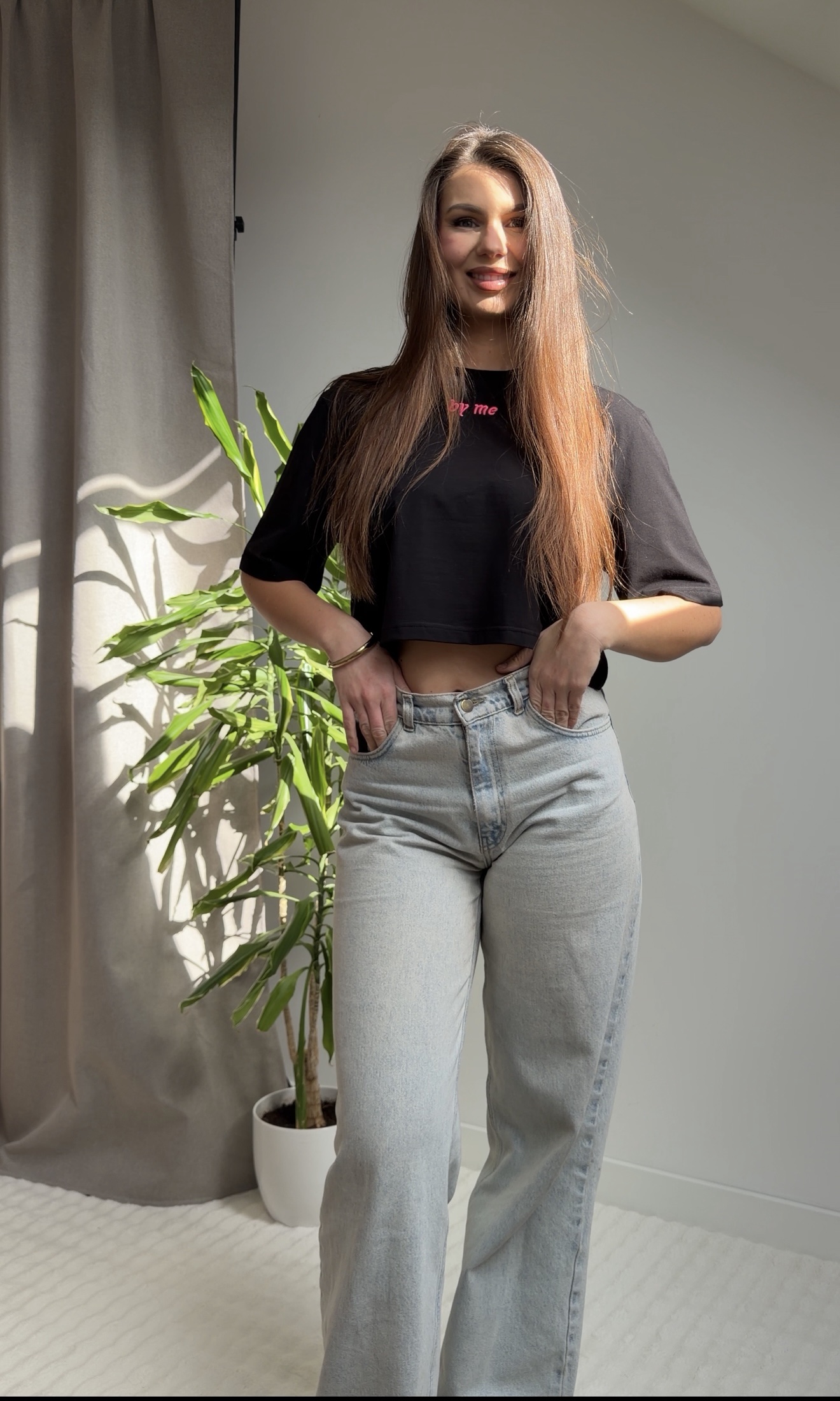 • Fason: Krótki t-shirt o luźniejszym kroju – lekko skrócona długość świetnie pasuje do spodni i spódnic z wysokim stanem.
